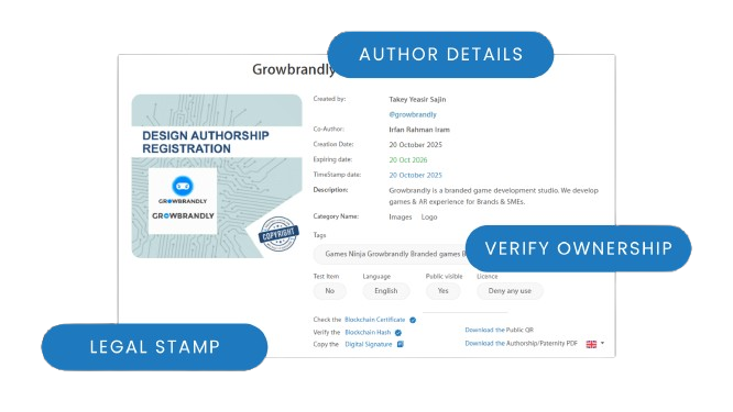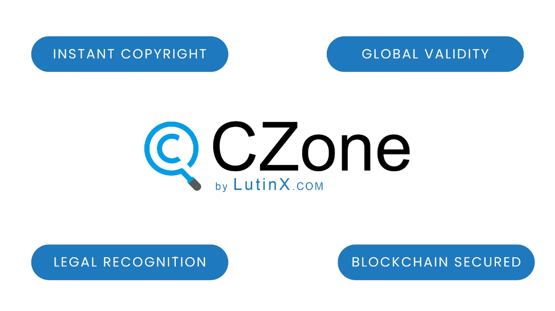 Copyright Zone (CZone) is a digital proof-of-ownership platform that protects your creations using Blockchain and KYC verification. It gives you a tamper-proof certificate with a timestamp, proving when and by whom the work was created.